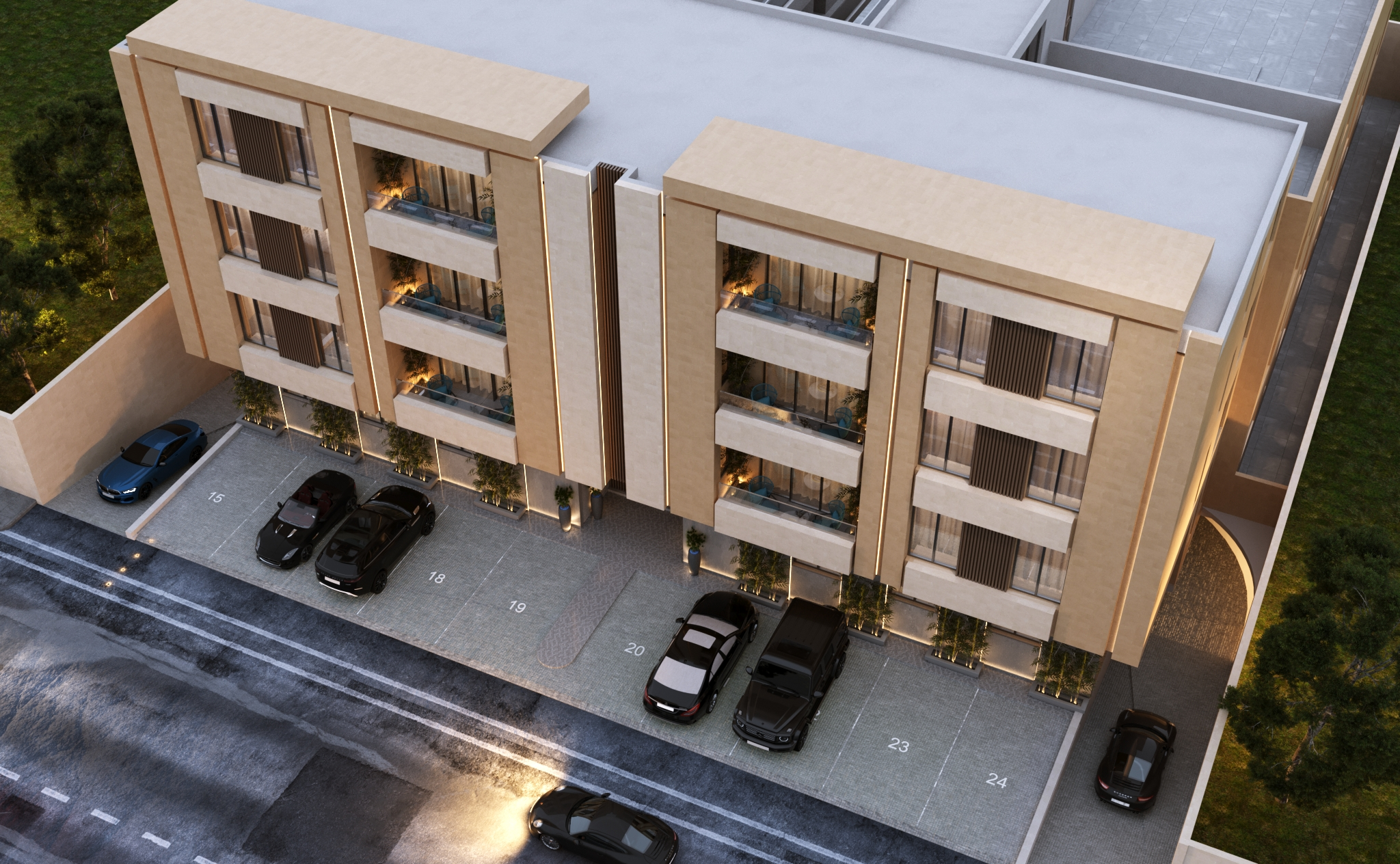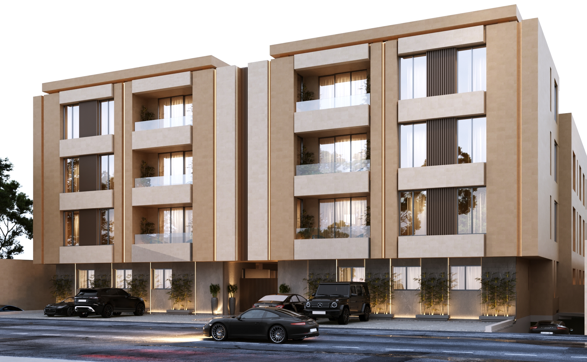Glass openings and balconies are carefully distributed to create a visual connection between indoor and outdoor spaces, while elegant exterior lighting enhances the façade’s details and accentuates the project’s refined identity at night.