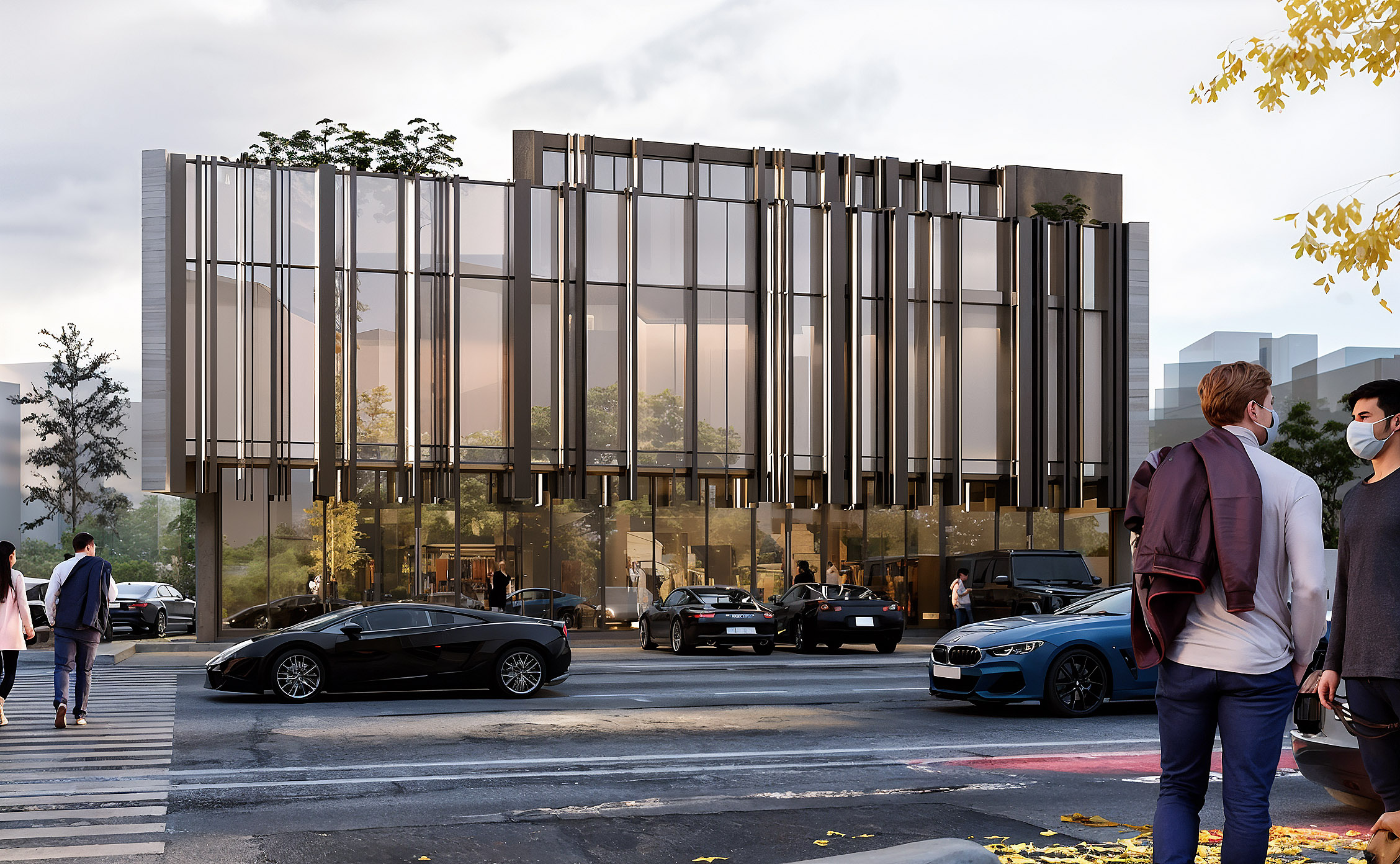 The building’s layered composition creates shifting shadows throughout the day, emphasizing the interaction between architecture and natural light while giving the structure a strong street presence.