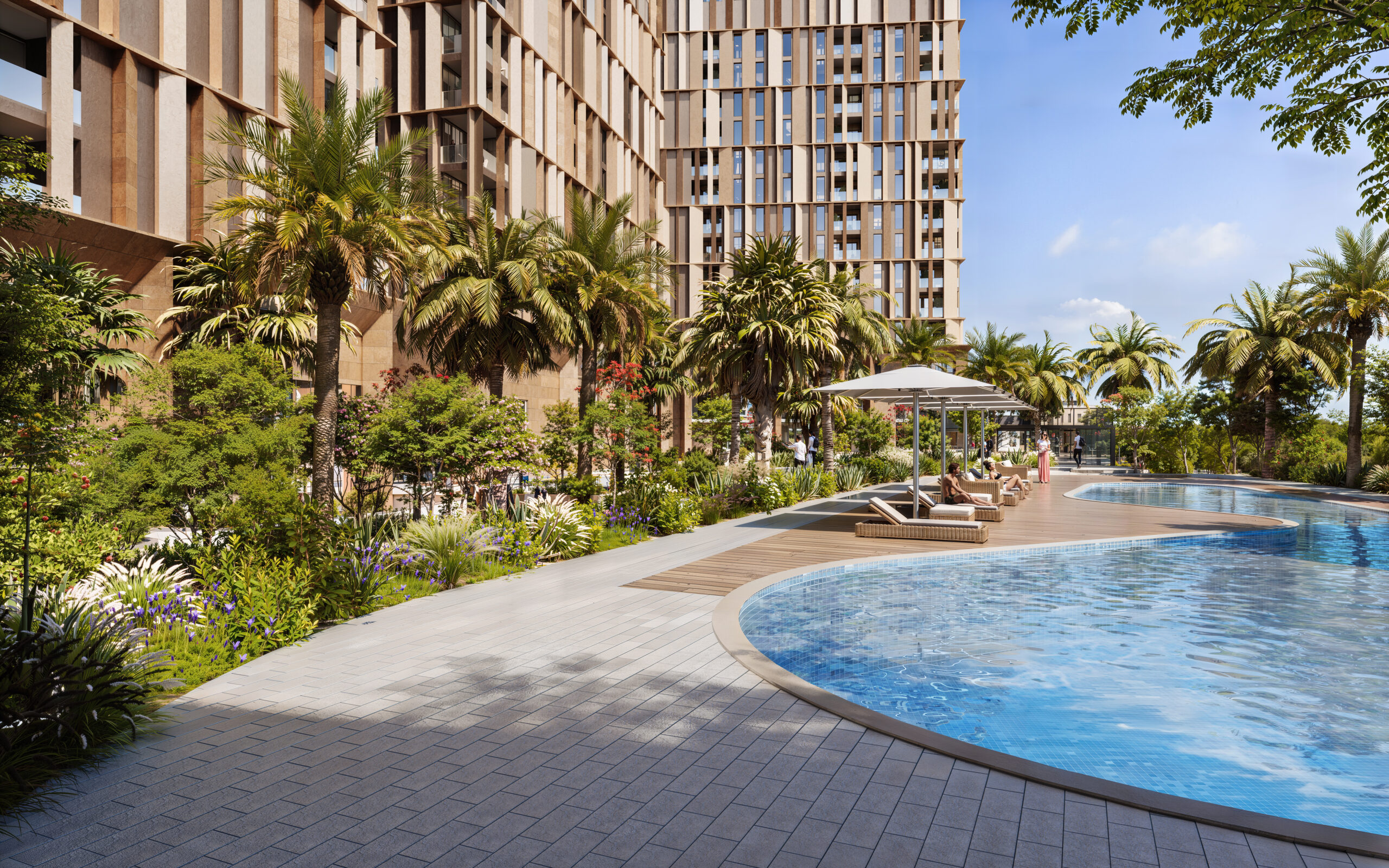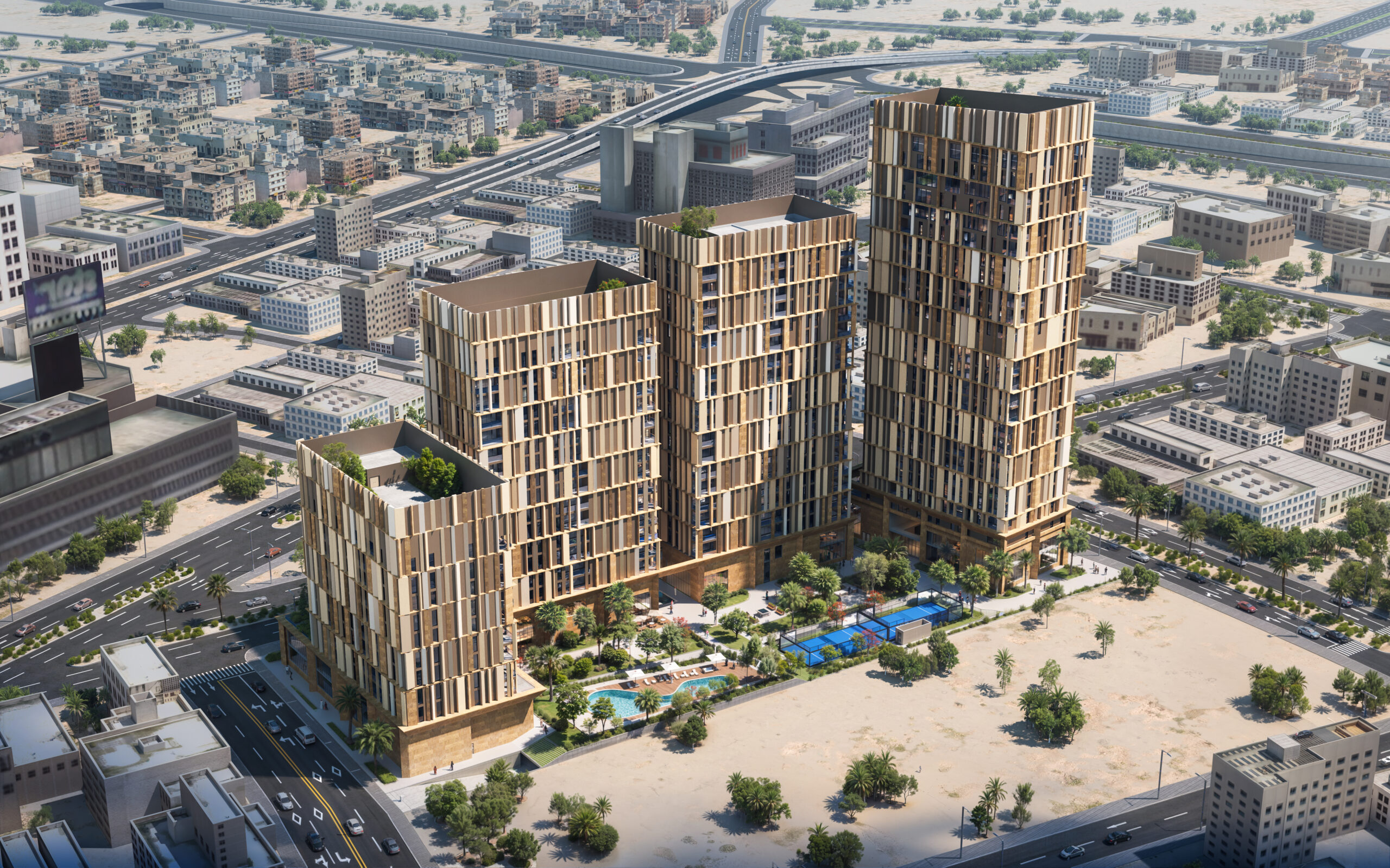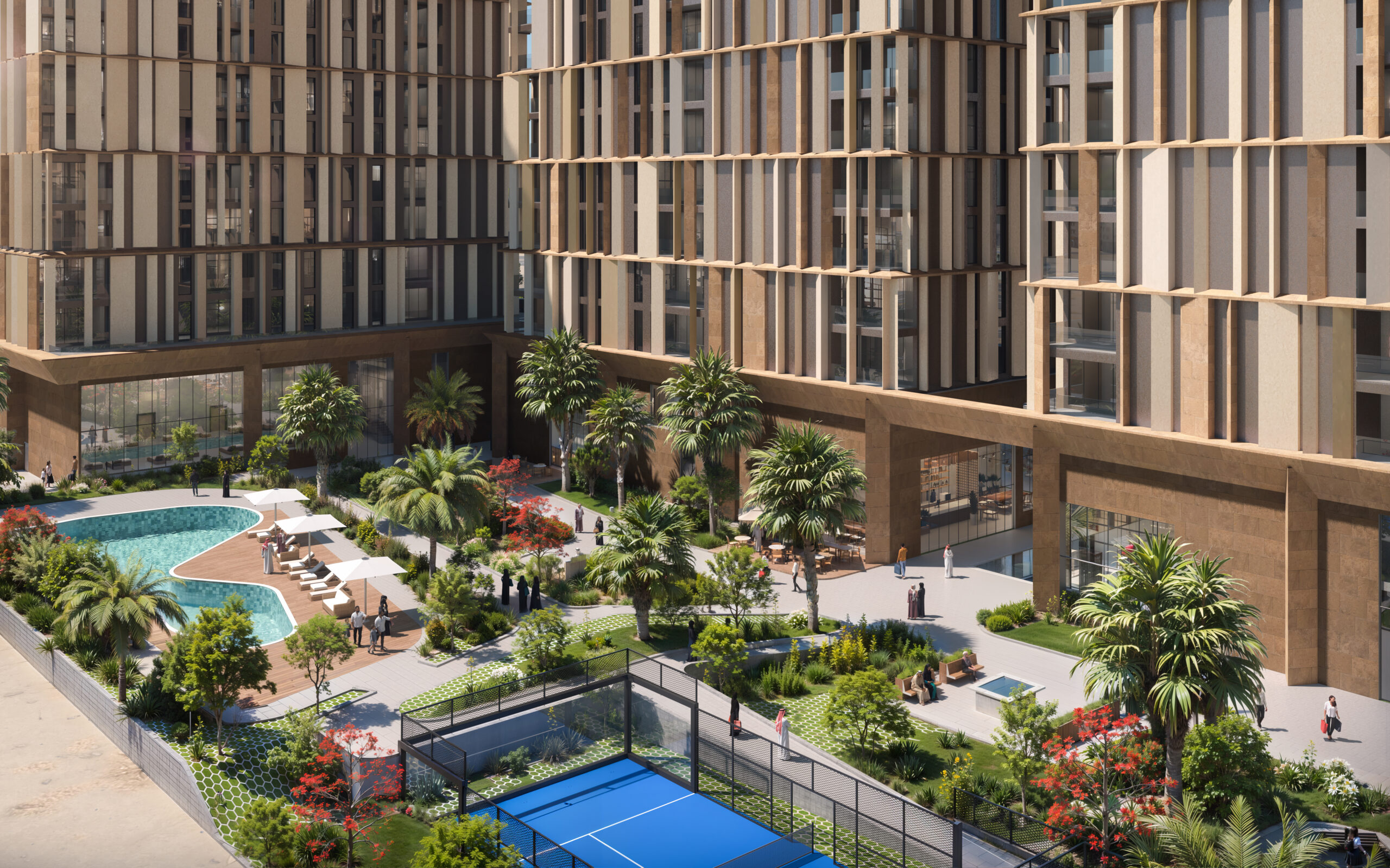 تتوزع في المنصة المركزية للمجمع مساحات عامة نابضة بالحياة تضم مناطق خضراء، مسابح، ومرافق ترفيهية تعزز من التفاعل الاجتماعي وتدعم أسلوب حياة متكامل. أما الواجهات الخارجية فتتميز بمعالجات عمودية حديثة وألوان دافئة تمنح المشروع هوية معمارية فريدة تعكس الحداثة وتستحضر أصالة البيئة الحضرية في الرياض.