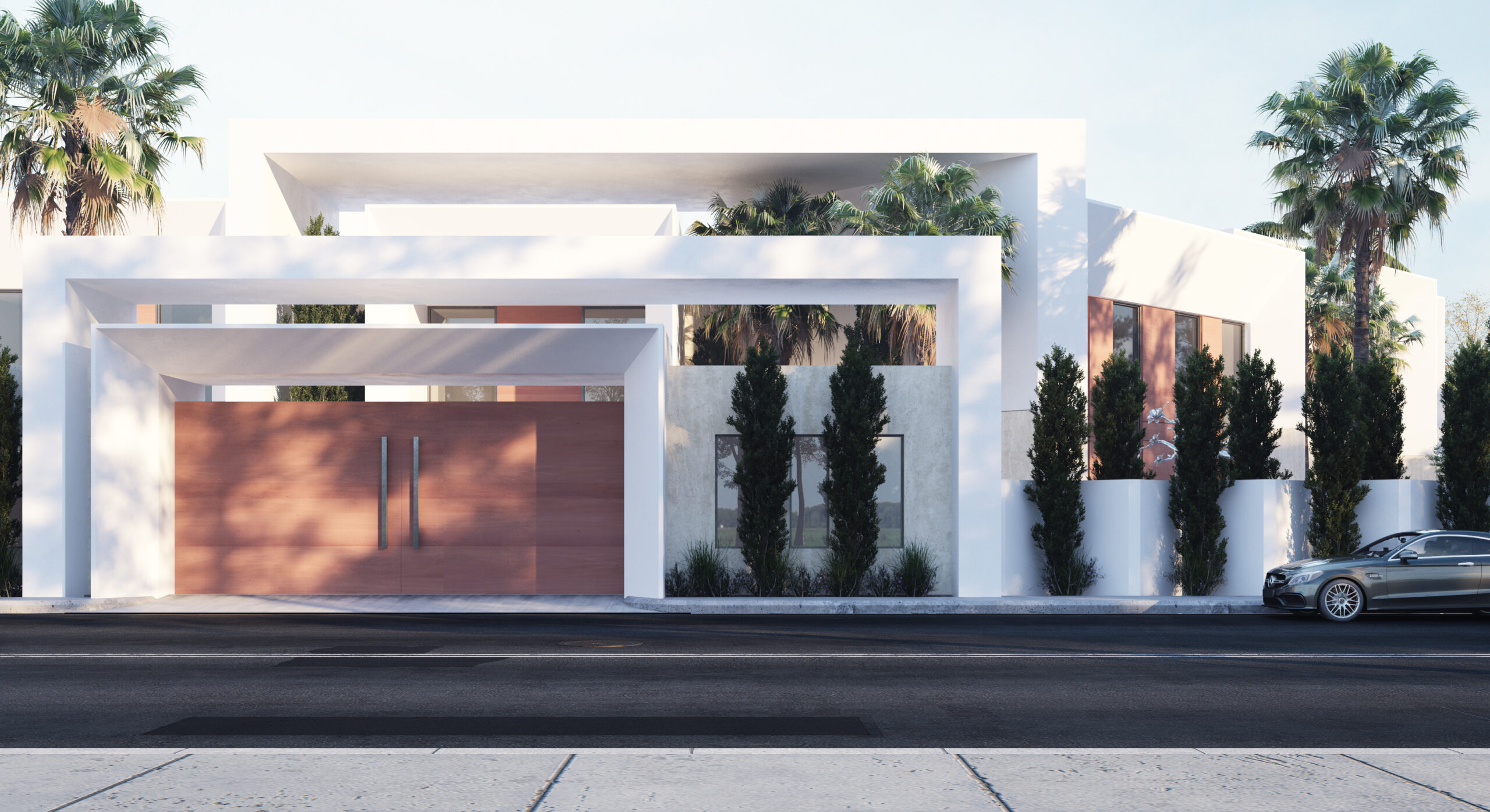 تعتمد الواجهة على التكوين الهندسي النقي والخطوط الأفقية الممتدة التي تمنح المبنى حضورًا معاصرًا متزنًا، فيما تضيف العناصر الطبيعية من أشجار النخيل والنباتات المحلية عمقًا بصريًا وحيوية للمشهد العام.