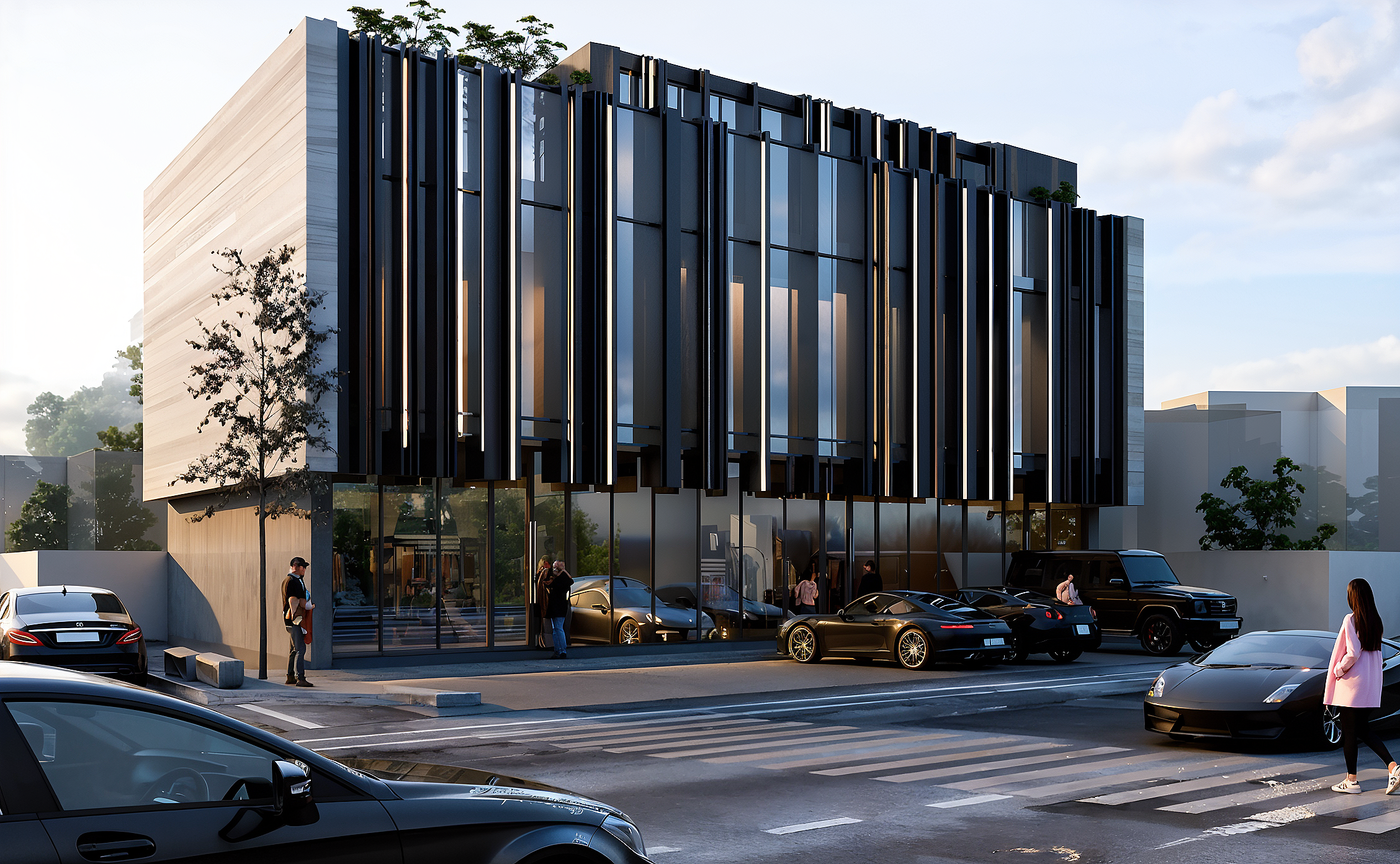 تم استخدام المواد الحديثة مثل الزجاج والمعادن الداكنة بتوازن دقيق يمنح الواجهة مظهرًا راقيًا وقوة معمارية واضحة.
